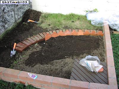 整地し、過去の遺物「芝」を剥がし、レンガを並べ直し・・・。